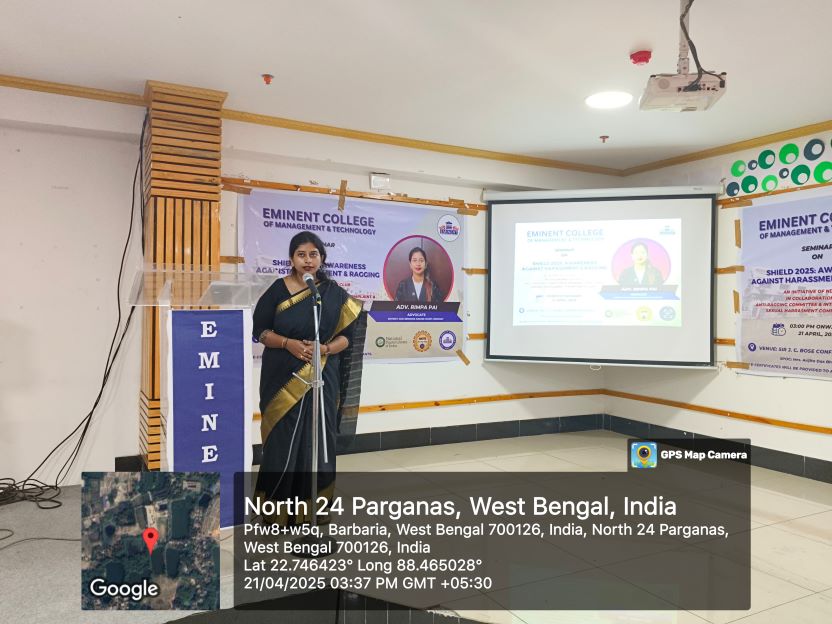 SHIELD 2025 was organized on 21 April 2025 as a joint initiative of the Internal Complaints Committee (ICC) and the Anti-Ragging Committee (ARC). The programme included awareness sessions for both students and faculty members. The session was conducted by Adv. Rimpa Pai, External Member of the ICC, Eminent College of Management and Technology. It was an enriching and informative programme that highlighted legal safeguards, institutional mechanisms, and the collective responsibility to ensure a safe and respectful academic environment.